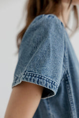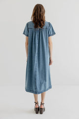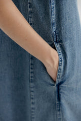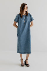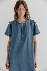 Jennie is a long denim dress in soft cotton denim with a relaxed, straight silhouette. Designed with a round neckline and a short button placket at front, finished with subtle gathering at the shoulders. The dress has short sleeves and clean vertical seams with inseam pockets giving the dress a simple, everyday expression.