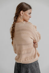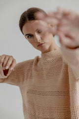 AGNES is a long sleeved soft cotton pullover made from cotton and acrylic. The cotton is Ecotec cotton and the knitwear is made in Italy. The knit has knitted patterns, crewneck and a slim ribbed trim.