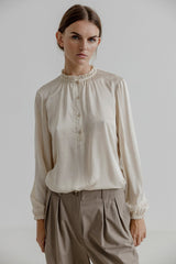 ROSITA is a loose feminine shirt with a regular fit. The delicate fabric is made from an Italian viscose/silk mix and the solid colors are garment dyed with a special technique. The shirt has a placket down at front and elastic around the neck line to create small frills. There is also elastic cuffs and the hemline is slightly rounded.