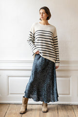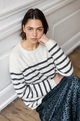 CARRIE is a new striped winter pullover with round neck and long sleeves.The delicate baby alpaca makes the knit super soft and comfortable. The knit is a bit longer at the back than at front.