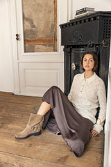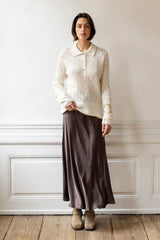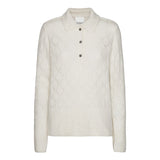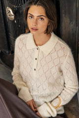 CLOTILDE is a new knitted polo with collar, placket with buttons and long sleeves. The knit has a pointelle structure with tiny decorative holes in a graphic pattern. The polo has long ribs at sleeves and at hem. The delicate baby alpaca makes the knit super soft and comfortable.