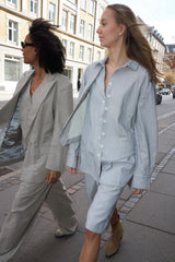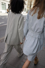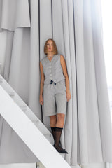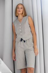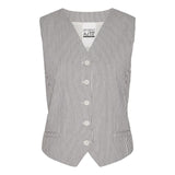 FERGIE is a chalk and black stripped denim waistcoat. The FERGIE waistcoat has a v-neck, two welt pockets, front button closure and elastic waist at back.