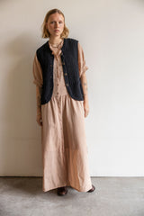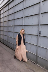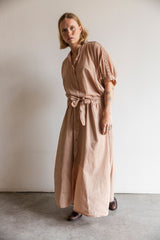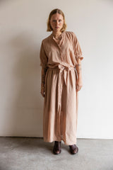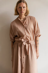 PALMA is a loose fitting dress in a light and airy cotton quality. The dress has an embroidered panel on sleeves and buttons all way down at front. The elbow length sleeves are softly gathered to create a light puff effect with a fastened cuff. The dress has a loose belt and belt straps. There is an inner skirt attached from waist down.