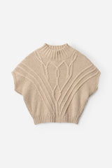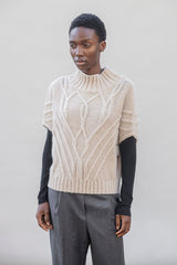 SIGNE is a chunky short-sleeve knit with a high ribbed neck and sculptural cable details.