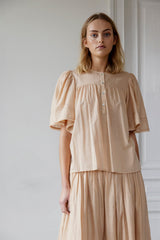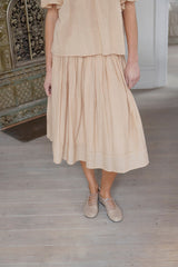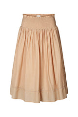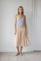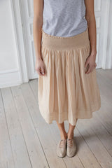 Candise is a soft skirt with broad elastic at waist and lots of small pleats at hip. The skirt has an attached underskirt. The skirt has embroidered panels at hem. Pair the skirt with the matching shirts Caden or Cleo for a full set.
