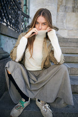 VILMA is a lightweight turtleneck knit crafted from a soft alpaca merino blend with a delicate, textured structure.