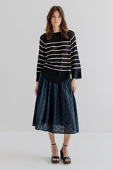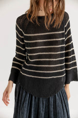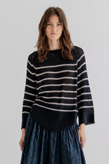 BOBO is a lightweight striped knit with a relaxed silhouette and flared sleeves. The design features a round neckline and raglan sleeves with subtle rib detailing. The hemline is curved and slightly longer at the back, adding a soft movement and feminine finish. Knitted in Italy in a breathable cotton blend, the style has a sheer look and airy feel – ideal for layering in warmer months.