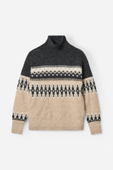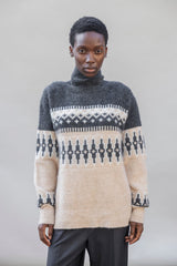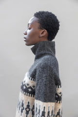 Knitted in a rich alpaca blend, the sweater features dropped shoulders, voluminous sleeves and a tall ribbed neck for extra warmth. The intricate jacquard pattern adds a crafted, heritage-inspired feel. Designed for comfort and layering through the colder months.