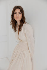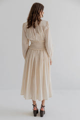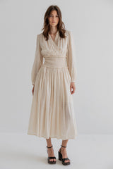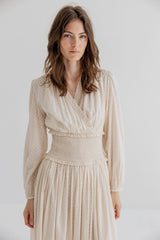 The dress features a wrapped top with a deep V-neckline with gathered details. The long sleeves are finished with narrow cuffs and the wide smocked waistband defines the waist. Designed in a light cotton dobby fabric with a subtle dotted texture, the dress falls into a full, flowing skirt with a mid-length hemline.