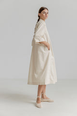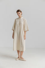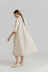 HARI is a new dress in our basic collection of organic cotton. The dress has collar and a placket with hidden buttons. The sleeves are ¾ length. The dress has pockets in front seams and has an airy and comfy fit.