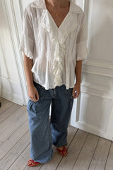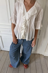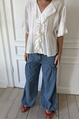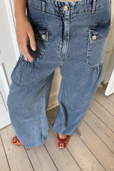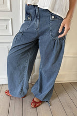 Jaelle is a wide leg denim pant in soft cotton denim with a relaxed fit. Designed with a fixed waistband, belt loops, zipper and button closure. The style features distinctive front pockets with flap and button detail, gathered volume below the pockets, and adjustable ties at the hem that allow you to wear the pants loose or slightly tapered.