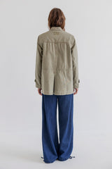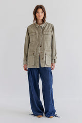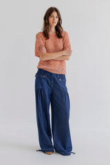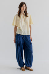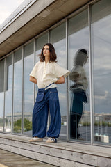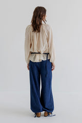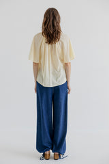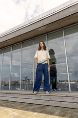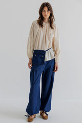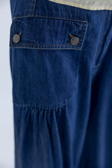 Jaelle is a wide leg denim pant in soft cotton denim with a relaxed fit. Designed with a fixed waistband, belt loops, zipper and button closure. The style features distinctive front pockets with flap and button detail, gathered volume below the pockets, and adjustable ties at the hem that allow you to wear the pants loose or slightly tapered.