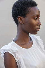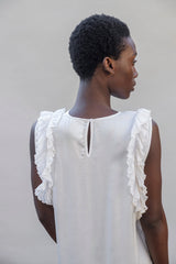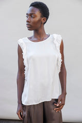 This sleeveless blouse is crafted in a refined silk–viscose blend. The blouse has a clean round neckline and delicate ruffle panels tracing the armholes for a feminine, airy expression. The silhouette falls gently over the body with ease and lightness. The shirt can be paired with the matching Rita pants.