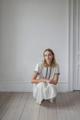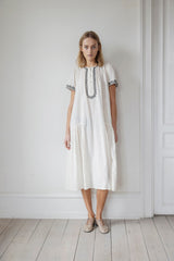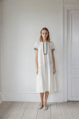 MOIRA dress is a cotton slub dress with contrasted embroideries at sleeves, neckline and around the placket. The dress has buttons at front and small pleats below hip to make a more flowy skirt. The dress comes with a slip dress in matching color.