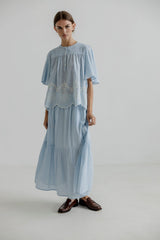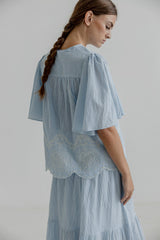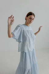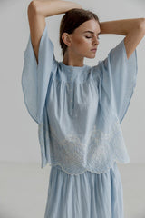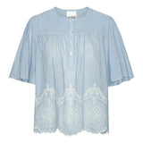 CLEO is a striped shirt with wide short sleeves and round neck with placket. The shirt has small pleats at front and back and embroideries at hem.