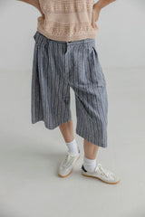 FIGO are shorts with fine pinstripes in an Italian cotton/linen quality. The shorts are wide-legged with pleats at front and a single welt pocket at back. At front there is a hidden zipper closure and a button.