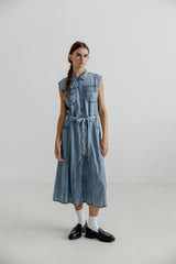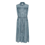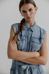 KENNA is a sleeveless denim dress in a super soft tencel denim. The dress has collar, buttons, two breast pockets and two side pockets. The dress also has a belt and belt loops. A super soft and comfortable dress.