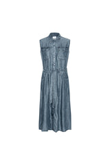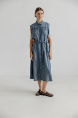 KENNA is a sleeveless denim dress in a super soft tencel denim. The dress has collar, buttons, two breast pockets and two side pockets. The dress also has a belt and belt loops. A super soft and comfortable dress.