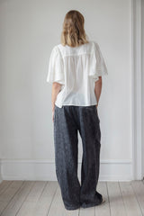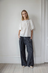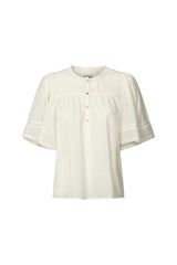 CLEO is a feminine shirt with wide fluffy sleeves with details of embroideries. The shirt has round neck with placket and small pleats at front and back. The shirt can be paired with the matching Candise skirt for a full set.