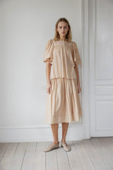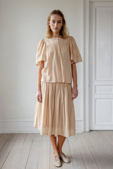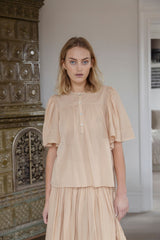 CLEO is a feminine shirt with wide fluffy sleeves with details of embroideries. The shirt has round neck with placket and small pleats at front and back. The shirt can be paired with the matching Candise skirt for a full set.