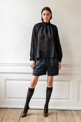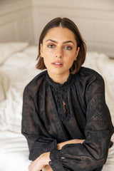 DINA is a new feminine shirt with embroideries and frills. The shirt has high neck with a v-neck covered by frills. The wide sleeves have cuffs with frills at wrist. The shirt has structured pattern which is slightly see-through.