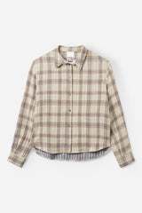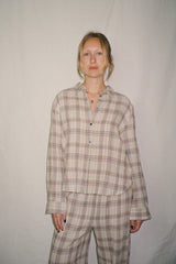 MELANIE is a waffle cotton shirt with a classic collar and button-down front. Designed with long sleeves and cuffs, creating a relaxed yet structured silhouette. The shirt is longer at the back than at front. The fabric is sourced from Italy and features stripes on one side and checks on the other side. The shirt is not reversible but both options are available. The fine yarn adds a soft texture and lightweight feel, making it comfortable for everyday wear. The shirt can be paired with the Maggie skirt or Mea Pants for a complete set.