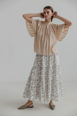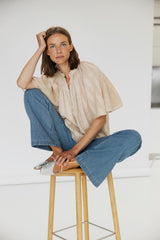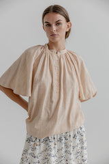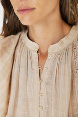 The popular Sandie shirt is back in new colors. This feminine short sleeved blouse has an a-shaped silhouette and a loose fit. The raglan sleeves are wide which gives a flattering and elegant look. The blouse has handmade exclusive lace embroideries as inserted pieces as well as hand embroidered tapes. The neck has a small standing collar and buttons down center front. The fabric is super soft and delicate and has a light feel.