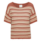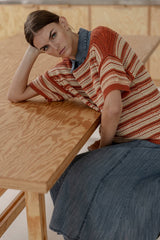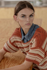 AERO is a soft short sleeve knit made from cotton and acrylic. The knit has stripes in 3 colors and a knitted hole patterns. The shirt has slim ribbed trims at sleeves and hem. The cotton is Ecotec cotton and the knitwear is made in Italy.