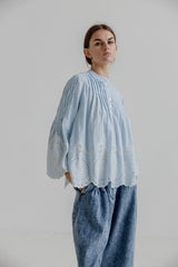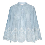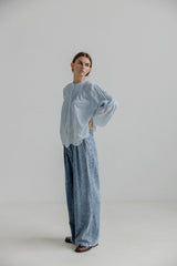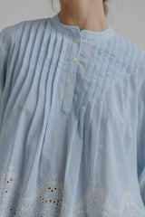 Clementine is a striped shirt with lots of pleats on front, back and upper sleeves. The shirt has embroidery at bottom and end of sleeves. There is a placket with buttons.