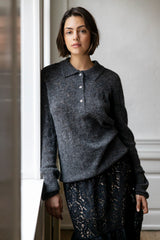 CLOTILDE is a new knitted polo with collar, placket with buttons and long sleeves. The knit has a pointelle structure with tiny decorative holes in a graphic pattern. The polo has long ribs at sleeves and at hem. The delicate baby alpaca makes the knit super soft and comfortable.