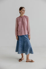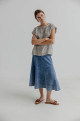 PAM is a our popular denim skirt in a super soft organic cotton denim. The skirt has zipper and button closure at waist and has panels to create a silhouette with more width at hem.