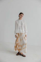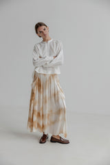 ROBERTA is a new feminine loose skirt in a delicate Italian viscose/silk quality with tie dye print. The skirt has fixed waist at front and elastic at back with a lot of tiny pleats. There are two loose open pockets at front.