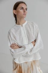 Sonya shirt is a feminine long sleeved shirt with handmade embroidery tapes at shoulder and back. The shirt has a placket with buttons and elastic loops. The hem is rounded and longer at the back than at front.