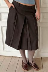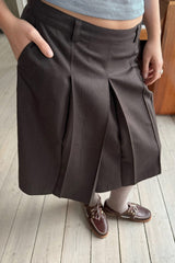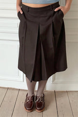 The skirt is designed with a clean waistband, belt loops and pleats at front and back. The skirt has side pockets and a hidden zipper at one side.