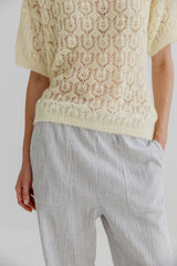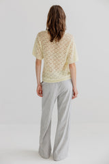PETRA is a delicate short-sleeved knit with an airy pointelle pattern and soft, slightly boxy shape. The texture gives a light and open feel while adding feminine detail to the surface. Style it solo or add the Petrine cardigan for a complete set.
