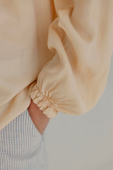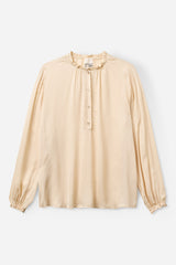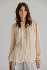 Crafted in a viscose-silk blend from Italy and garment dyed for a gently faded texture. Features a front placket, rounded hem and small frills created by elastic around the neckline and cuffs. A timeless piece for every season.