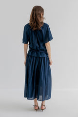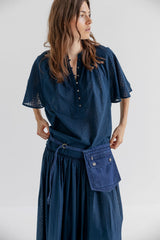 SANDIE is a short-sleeved shirt with a relaxed silhouette and soft drape. Designed with wide, airy sleeves and a buttoned half placket, the shirt falls loosely over the body and has a rounded hemline for a feminine touch. The fabric is a lightweight cotton dobby with subtle woven dots, adding texture to the simple shape.