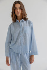 Cimber is a classic striped voile shirt in lightweight soft cotton. Designed with a collar, full button closure and a single chest pocket. The shirt is slightly rounded at hem. The relaxed fit and soft drape give the shirt an effortless expression, while the fine stripe texture adds subtle structure. The shirt can be paired with Cindie skirt or Cadera pants for a complete set.