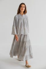 Clementine is a striped fine cotton shirt with pleats on front, back and upper sleeves. Along with the rund neck there is a buttoned placket. The shirt has decorative embroideries at hem and scalloped edging. The light voile quality gives the shirt an airy feel. The shirt can be matched with Cindie skirt or Cadera pants for a complete set.
