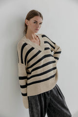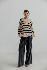 AIDO is a striped v-neck pullover in a soft quality. The pullover has knitted patterns and broad trimming at sleeves and hem. The knit is made in Italy and the cotton is Ecotec.