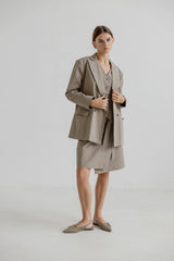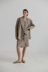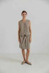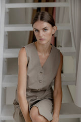 The FERGIE waistcoat has a v-neck, two welt pockets, front button closure and elastic waist at back. The vest is super cool to wear as a top but can also be paired with the matching TAILOR pants and FINNEA jacket.