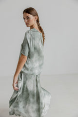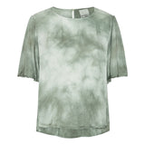 ROSE is a short sleeved shirt in a soft and delicate fabric. The Italian viscose/silk mix has beautiful tie dye print. The shirt has round neck with with slit and a button with elastic hook at back of neck. The shirt has small frills at shoulder and is bit longer at the back than at front.