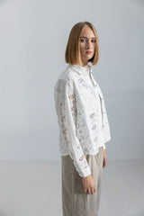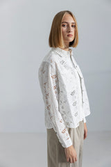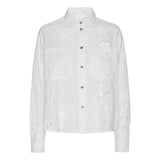 The HANNIE shirt made in soft cotton with an allover pattern of broderie Anglaise. The shirt has breast pockets, buttoned cuffs and is slightly rounded at hem. Wear the shirt open as a short jacket or close it for a feminine shirt look.
