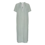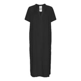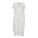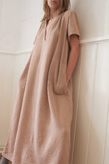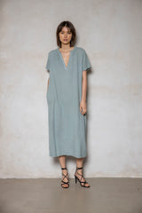 VIENNA is a straight, loose dress with short sleeves. The fabric is waffled and the dress has pockets and a deep v-neck.